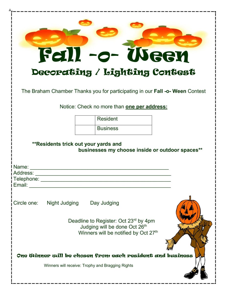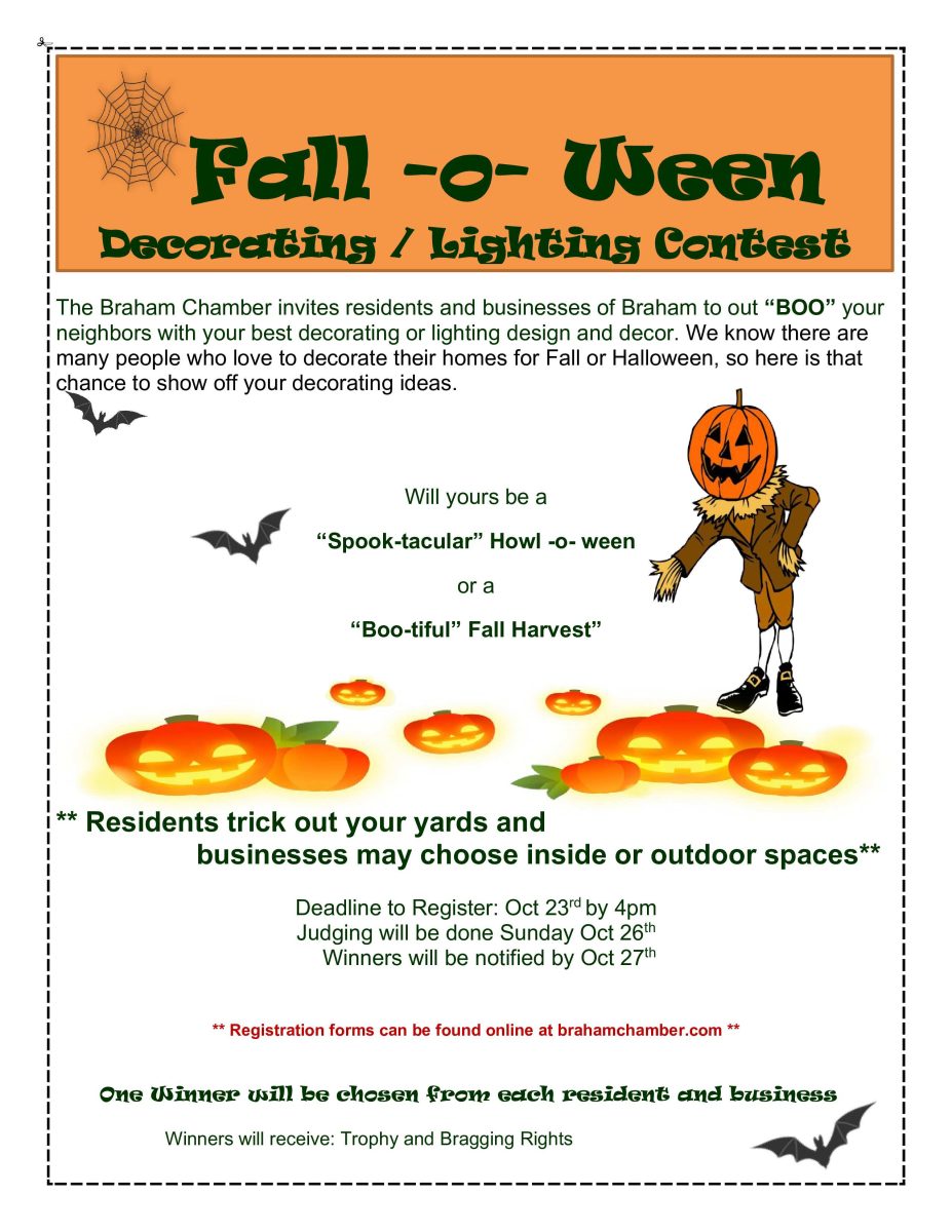 The Braham Chamber invites residents and businesses of Braham to out “BOO” your neighbors with your best decorating or lighting design and decor. We know there are many people who love to decorate their homes for Fall or Halloween, so here is that chance to show off your decorating ideas. Print the order form below OR click HEREto enter the Fall-O-Ween Decorating/Lighting Contest!